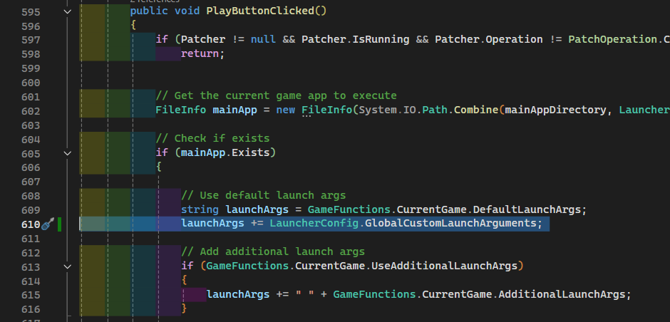 Then, in *Models/Patcher/PatcherFunctions.cs,* **locate PlayButtonClicked()** function and add this line after `string launchArgs declaration`